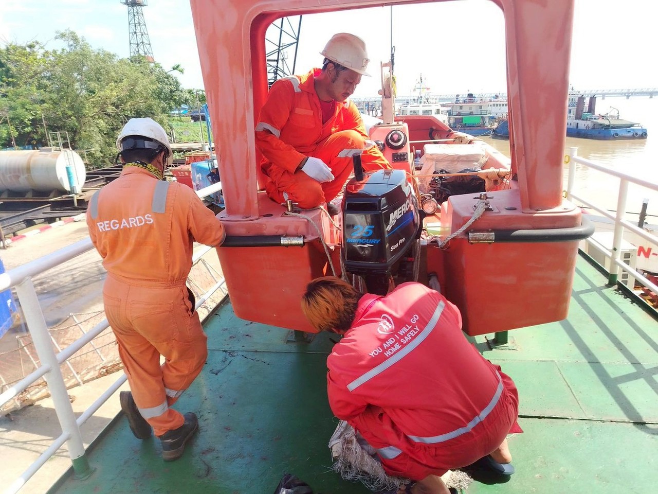 SMS Stanza–Yangon, Myanmar. MS arranged LSA services for the vessel in Myanmar, including: Fixed CO₂ system and pilot cylinder servicing. Emergency Escape Breathing Device (EEBD) servicing. Self-Contained Breathing Apparatus (SCBA) servicing. Fireman’s outfit inspection. Rescue boat inspection and davit sheave renewal. Job is performed completely and meet the vessel requirements.