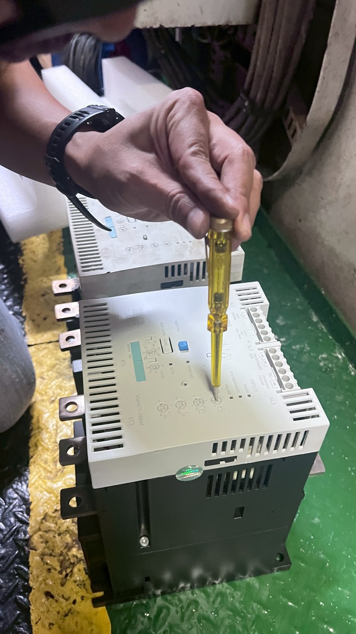 Rawabi Opal (Vessel from Indonesia).The soft starter for the power pack is damaged and cannot properly operate the winch motors. Repairing or replacing the same model is challenging due to its outdated design. Therefore, MS has proposed a brand-new soft starter model as a replacement. MS engineers boarded the vessel to install and configure the new soft starter to match the motor specifications. The work was successfully completed, and all winch functions have returned to normal.